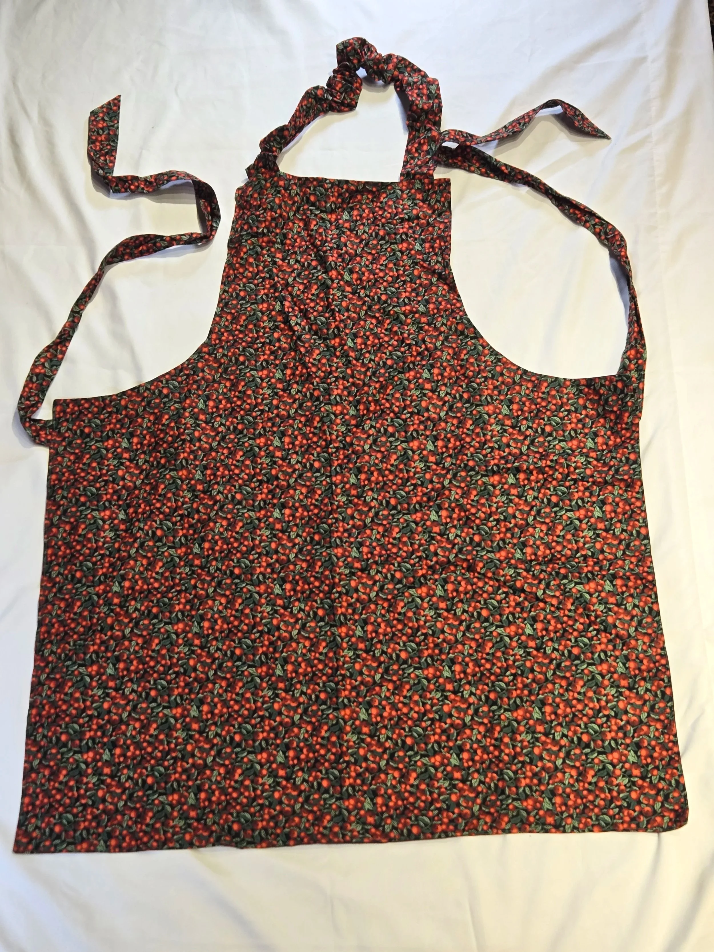 All of our aprons are 100% cotton. Adult Aprons measure approximately 36”Lx30”W, plus 60” total of strap length.
